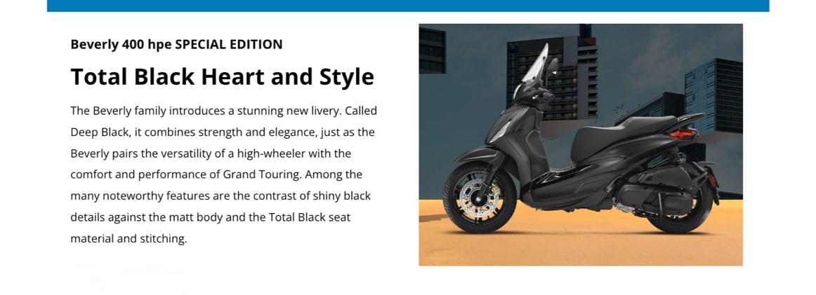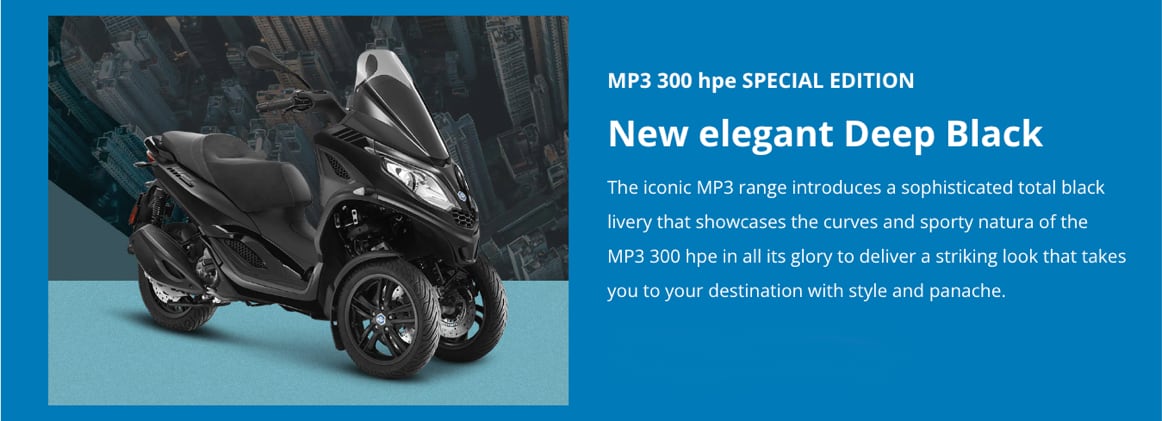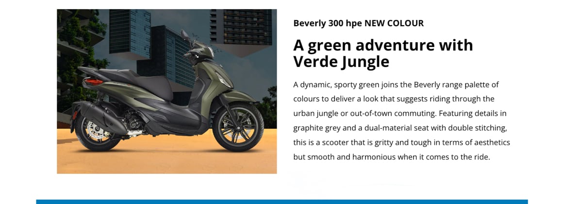 MINIMALIST, LIGHTWEIGHT, AND WITH REMOVABLE BATTERY, PIAGGIO 1 NOW OFFERS NEW AND IMPROVED PERFORMANCE TO TACKLE YOUR URBAN COMMUTE WITH EVEN MORE EASE AND SAFETY. AMONG THE OTHER PIAGGIO NEWS, THE SPECIAL EDITIONS PIAGGIO MP3 300 HPE DEEP BLACK AND BEVERLY 400 HPE IN TOTAL BLACK; AND BEVERLY 300 HPE NEW COLOR: GREEN JUNGLE.