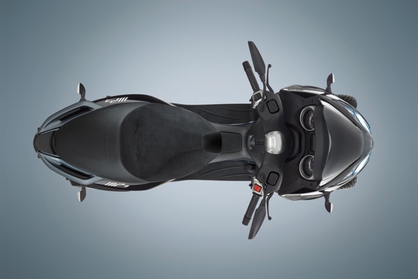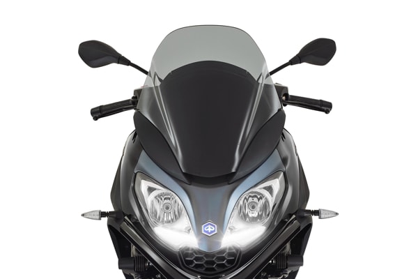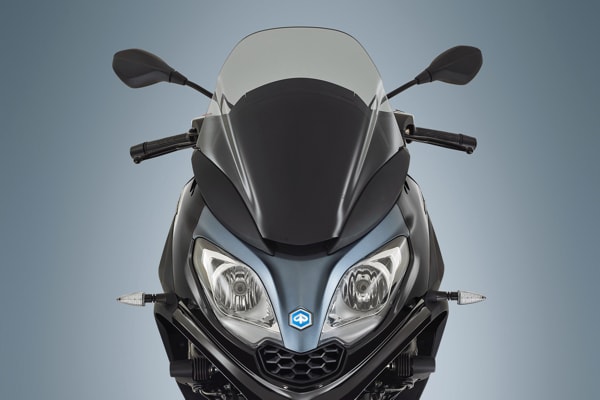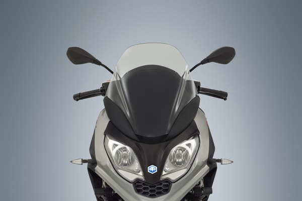 DYNAMIC AND SPORTY DESIGN. Piaggio MP3 300 hpe stands out for its modern and sporty design which harmoniously blends the aggressive front end with a sleek rear to provide a slender and light line. The front shield maintains the distinctive traits of the Piaggio MP3 maxiscooter family: the centre is dominated by the double headlight fitted with high efficiency LED daylight running lights, a solution borrowed from the automotive world that modernises the front view. The characteristic “neck tie” divides the headlights and acts as a connecting element between the grille and the built-in tinted windscreen designed to guarantee the best possible protection. Contributing to slimming down the front view, made unique by the double front wheels, are the sporty profile mudguards painted to match the body (Sport version), whereas the wheel rims have a five split-spoke design: another clear reference to the luxury sport saloon world.