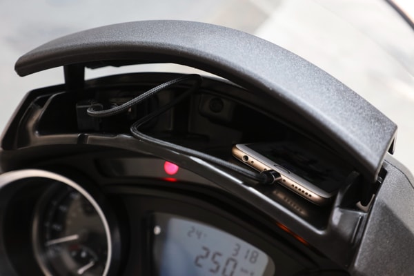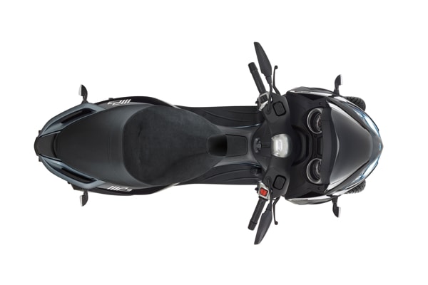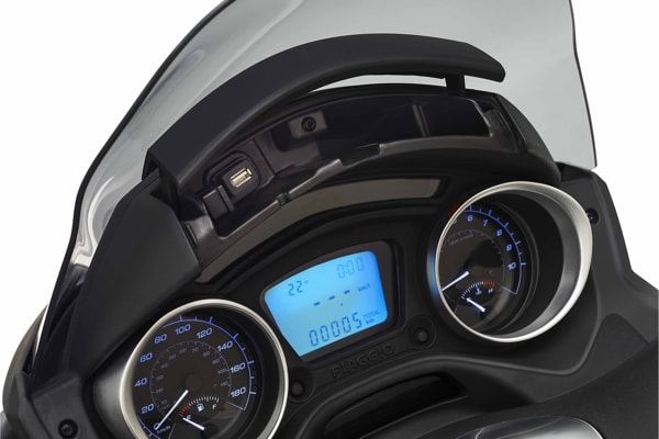 Like on the Piaggio MP3 “maxi” range models, the dashboard includes a modern instrument cluster made up of two conventional round displays and a multi-purpose digital display with data on fuel consumption (average and current), average and maximum speed, fuel gauge, travel time, and ambient temperature with ice alarm. The instrument panel also includes a clock, total and trip counter and battery voltage reader. The 11 lights on the instrument panel represent high beam function, indicator usage, reserve fuel, oil pressure, warning (injection), immobilizer, ABS, ASR and four emergency lights. Above the instruments, on the other hand, is a practical glove compartment with a drawer and USB connection, ideal for recharging a smartphone and any other enabled device.