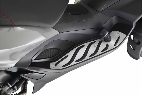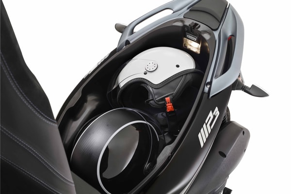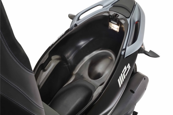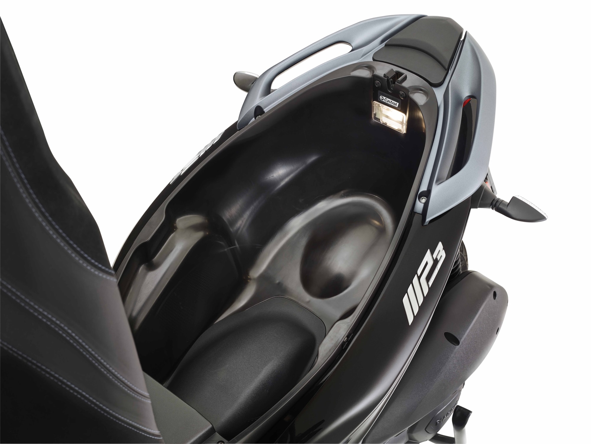 COMFORT AND FUNCTIONALITY. The new Piaggio MP3 300 hpe is comfortable and extremely functional. The saddle, with seating on two separate levels, is shaped in such a way so as to allow easy and safe contact with the ground and to guarantee adequate lumbar support for the rider, all to the advantage of comfort. The passenger position is laid back and relaxed, thanks in part to the practical fold-out foot boards which, when closed, integrate perfectly in the fairing. The combined braking system pedal, on the right foot board, has been repositioned for better global riding ergonomics. The under-seat compartment, extremely spacious, easily accommodates two jet helmets (one jet and one demi-jet). The saddle has a spring to keep it in the open position. A practical and discrete concealed bag hook finds a place integrated into the leg shield back plate.