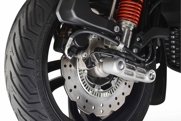 The three channel ABS system, developed in collaboration with Continental, maximizes active safety preventing wheel blockage when braking and providing full control of the vehicle at all times. The Piaggio MP3 employs an all-disc braking system on the three wheels, with a disc diameter of 258 mm on the front and 240 mm on the rear. Greater safety and an even smoother ride are provided by the large 13-inch diameter front wheels.