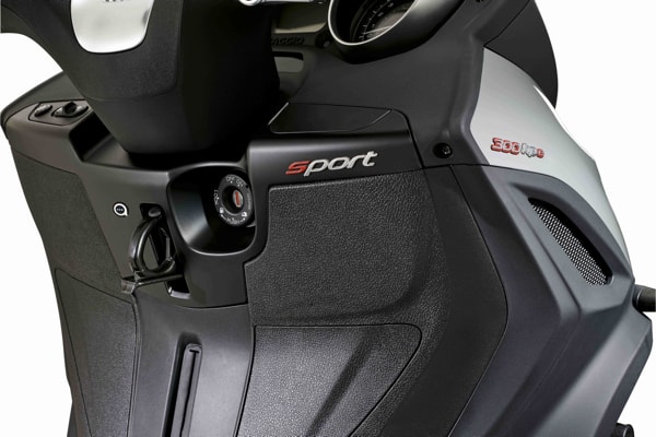 Piaggio MP3 300 hpe Sport. Piaggio MP3 300 hpe Sport stands out for its numerous details with matt black finish, such as the “neck tie” on the shield, the stripes on the centre tunnel and the passenger grab handles. Its sportiness is highlighted by the front and rear shock absorber springs painted red, a colour that also appears on the contrasting stitching of the seat. Front brake discs with a wave profile and a foot board with aluminium inserts are included as standard.