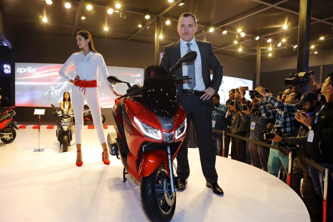 “Significant changes have taken place in Indian consumers’ preferences and requirements in the last few years,” said Piaggio India CEO Diego Graffi (in the photo below, during the launch at Auto Expo). “At Piaggio we have performed extensive analysis and design work to understand and anticipate developments, and we proudly present the new Aprilia SXR 160, a scooter destined to set a new benchmark in its segment.”