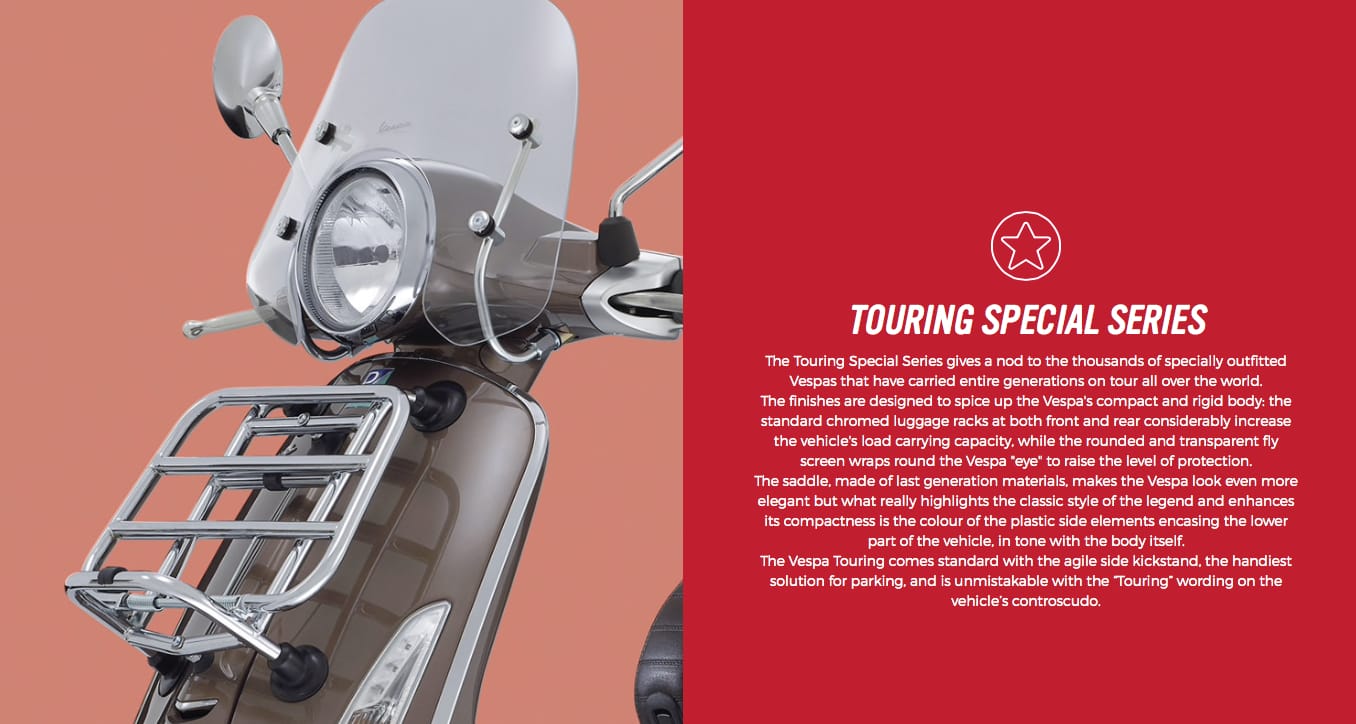 VESPA PRIMAVERA TOURING. Is inspired by the vocation for travelling that Vespa has always embodied in its long history thanks to a special set up. The Touring version includes all the changes and upgrades of the Vespa Primavera starting with the 12" twin wheels, and is enriched by chromed front luggage rack and rear luggage racks, as seen in the most classic Vespa iconography, which considerably increases the load capacity and readies the most loved scooter in the world for any adventurous journey.
