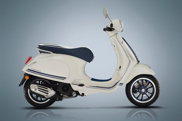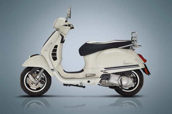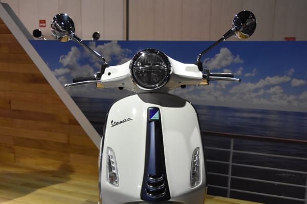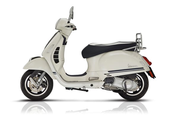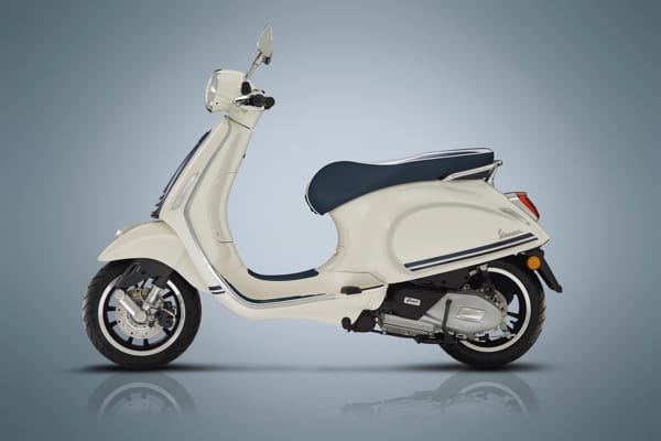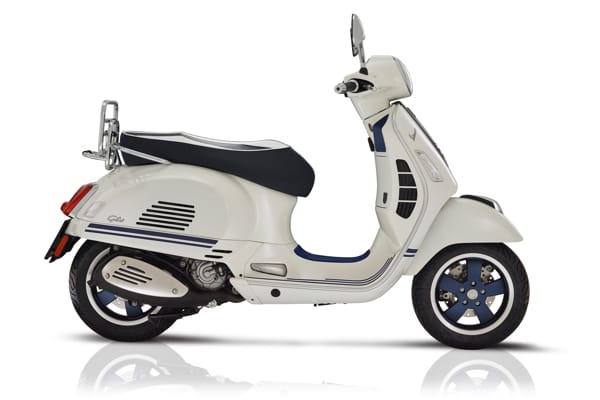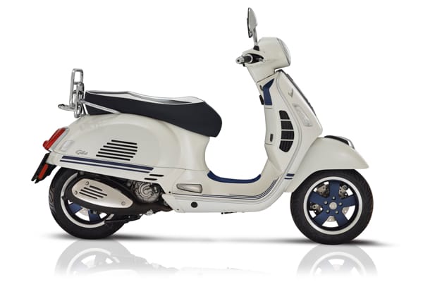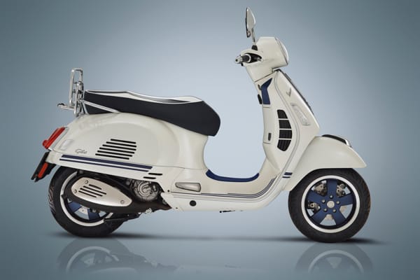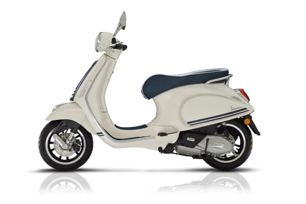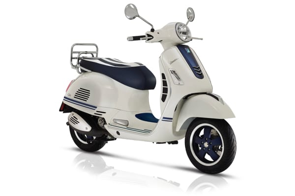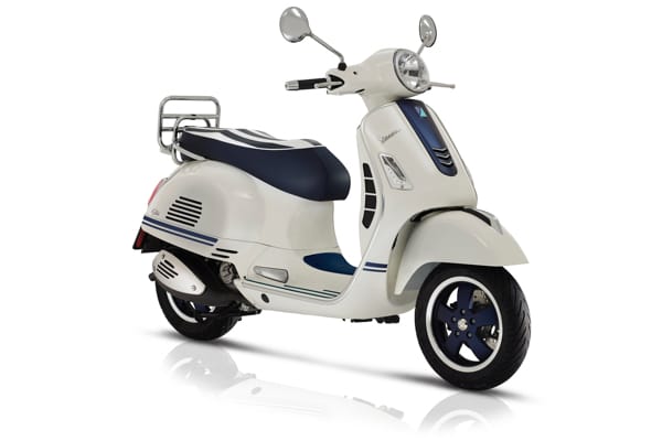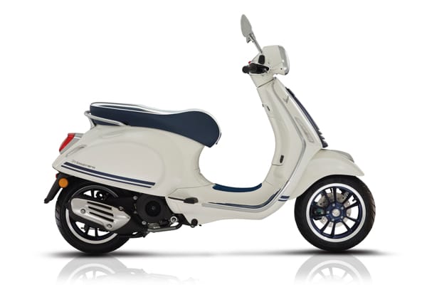 Vespa Primavera Yacht Club, available in 50 and 125 cc versions, and Vespa GTS Yacht Club, available in 125 and 300 cc versions, stand out for their white colour, embellished with numerous blue details. These include, besides the special graphics on the chassis, the rims, varnished an opaque blue with a special diamond finish, the "tie" on the front shield, also opaque blue with chrome ornaments, and the rubber inserts on the floorboard.