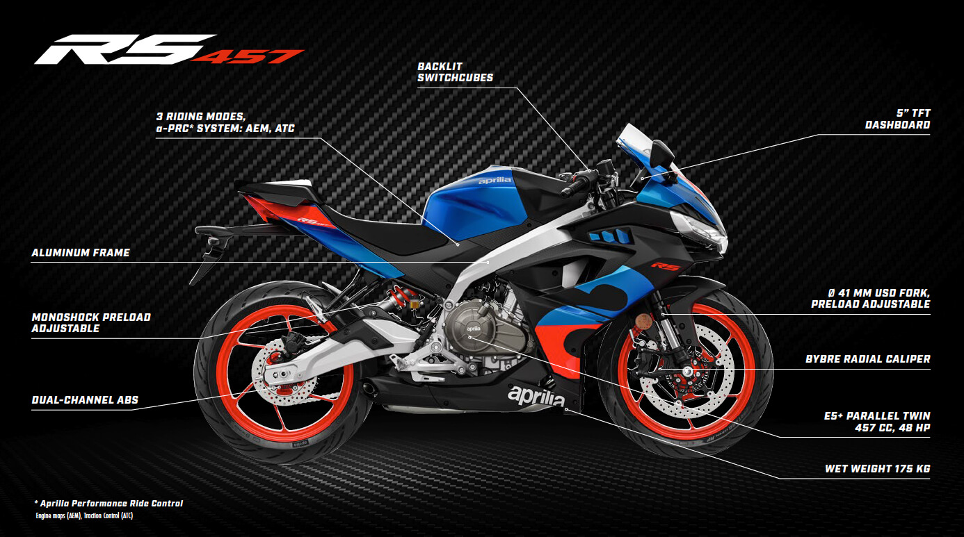 Aprilia RS 457. With the RS 457, Aprilia enters a segment with a focus on the future, both in terms of the next generation and new markets; this bike has been conceived to meet the growing demand for motorcycles that are easy to handle yet fun, boasting cutting-edge technology and design. The Aprilia RS 457 is the fruit of a completely new design, with key strengths include its lightness (it has the best possible power-to-weight ratio for a bike that can be ridden on an A2 licence), its ease of handling and its technological equipment. The RS 457 is designed to support riders as they grow and develop, both on the road and on the track.