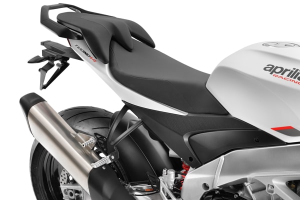 Tuono V4 adopts all the best characteristics of a street-legal sport bike that also looks at the longer routes. The comfort provided by the raised handlebar and the more protective top fairing is new and improved. The passenger is no longer a barely tolerated guest and now benefits from an ample and comfortable portion of saddle and lower footpegs. Tuono V4 turns its thoughts to new horizons to reach quickly, so the available accessories include a pair of dedicated, asymmetrical panniers.