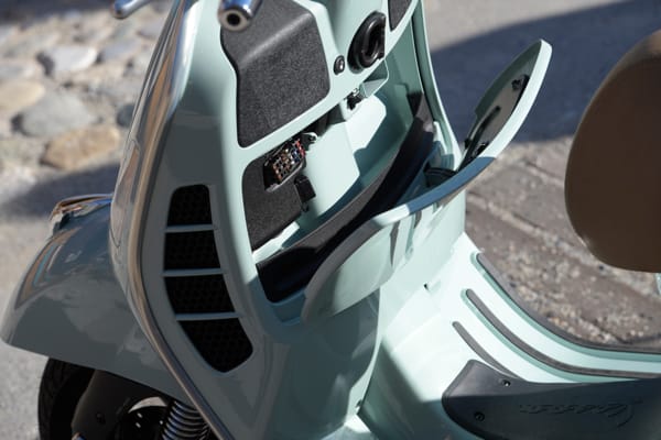 The under-saddle compartment makes optimum use of the available space and can accommodate two Vespa Visor 3.0 demi-jet helmets and more. Also adding to the load capacity of the Vespa GTS is the glove box, inside which there is a USB port, useful for the charging of external devices.