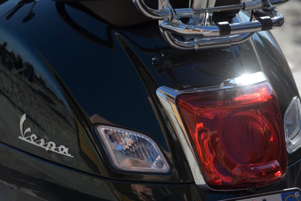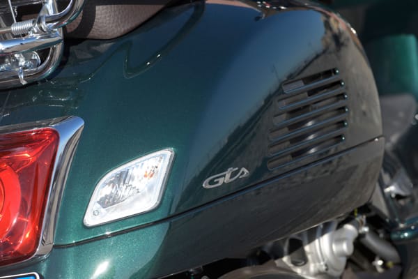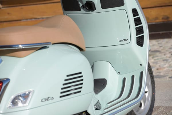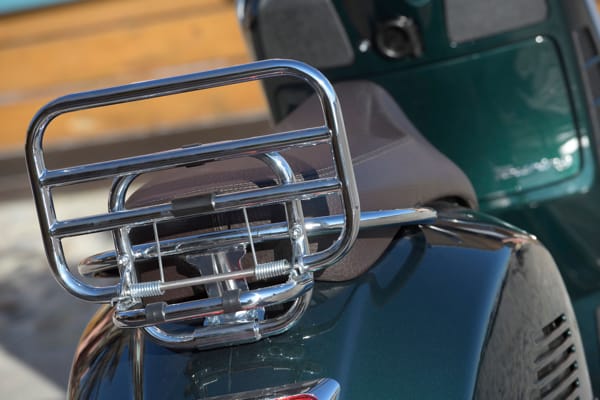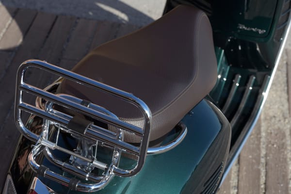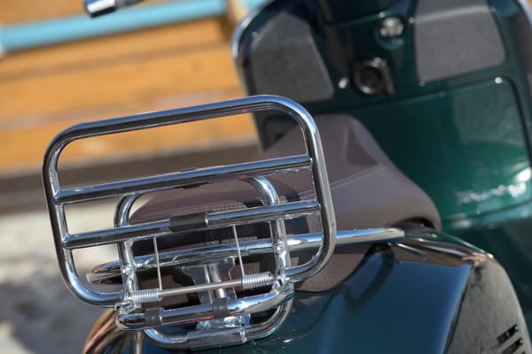 ACCESSORIES. In line with Vespa tradition, the new GTS boasts a wide range of accessories with which to personalise the vehicle and increase comfort and functionality. The top box, which can accommodate a full-face helmet or two jet helmets, is painted to match the chassis and comes complete with a padded backrest to optimise passenger comfort. The chrome front and rear luggage racks are among the most requested and appreciated accessories and characterise the Vespa personality in a strong and distinct fashion, as well as underscoring its long touring history.