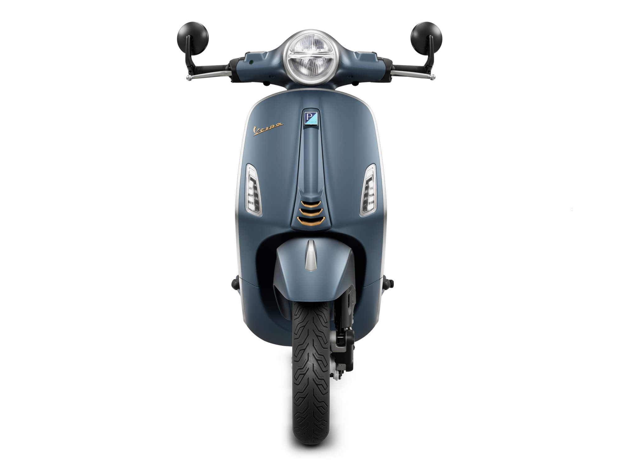 This colour creates an original contrast with the elegant satin-finish metal accents, which are also highly evocative: aluminium, which embellishes the profile of the shield and the headlight and rear light surrounds, along with brass, which decorates the steering cover grille and wheel rims, the latter of which also feature a diamond-cut finish on the channel. Colours and materials typical of mechanical workshops and the world of aeronautics and beyond: indeed, the Vespa Officina 8 also brings back the much-coveted brass and blue resin pin worn with pride by members of the historic Experimental Department. On the back plate, the three-dimensional plate dedicated to this model reinterprets the famous pin with a modern slant - a symbol of passion and craftsmanship.