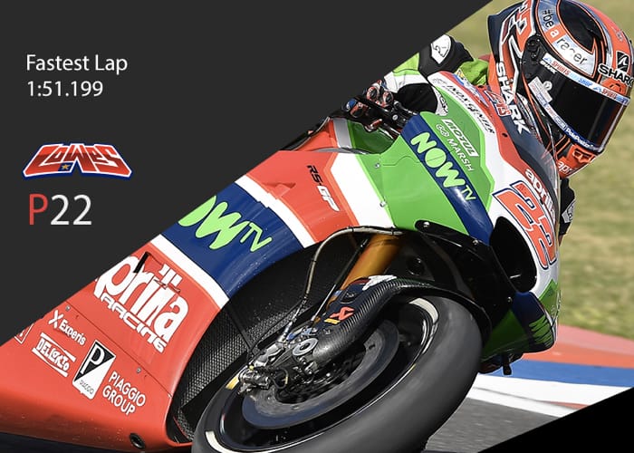 The Aprilia Racing Team Gresini rider, who started from the eighth spot on the grid that he had earned yesterday (1'49.323, third row), started well, staying in the group. Settling into eleventh place during the first lap, he set his pace, staying with the riders battling for the positions from fourth through seventh. On turn 5, he found his way past Petrucci and Dovizioso who had gone a bit wide while duelling. When he lost the front end, he went into a slide, colliding with a blameless Dovizioso. The good performance seen during practice and in the race remains, with the RS-GP once again competitive, especially over race distance and capable of battling for important positions in any condition.