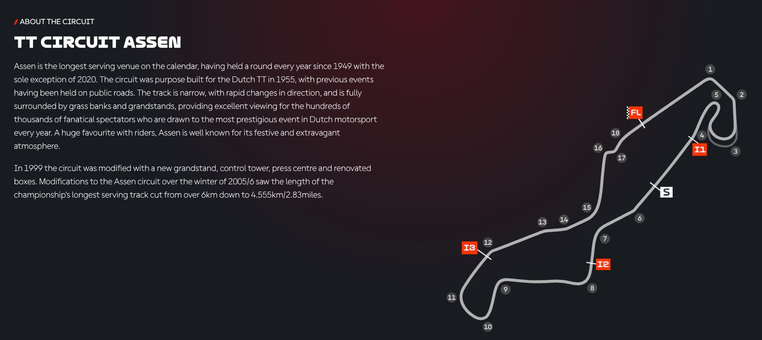 The Assen TT Circuit, nicknamed “The Cathedral of Speed”, is a historic FIM World Championship track and has hosted the Grand Prix since 1949. Assen is famous for its technical and demanding layout, made up of 18 turns – 6 left-handers and 12 right-handers.