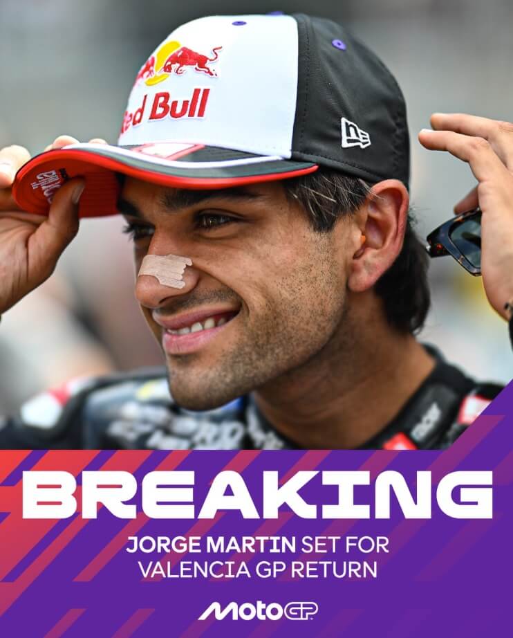 Jorge Martín will travel to Valencia for the Grand Prix of the Valencian Community. The Spanish rider, who has been absent since the Japanese GP due to a displaced fracture of his right collarbone sustained during the sprint race, will still need to undergo evaluation by the FIM Grand Prix World Championship Medical Team in order to receive clearance to race. The 2025 season was particularly difficult for the Spaniard due to four injuries: first in the Sepang tests, then during training, followed by an injury in the Qatar race, and lastly in the Motegi sprint race. The goal for the weekend will be to assess his physical condition after more than a month and a half of downtime.
