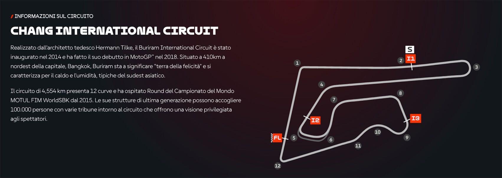 The Chang International Circuit, located in Buriram, was built in 2014, and hosted its first MotoGP event in 2018. The track is 4,550 metres long, with 12 corners: 7 to the right and 5 to the left, and the layout alternates very long straights with sections demanding challenging braking.