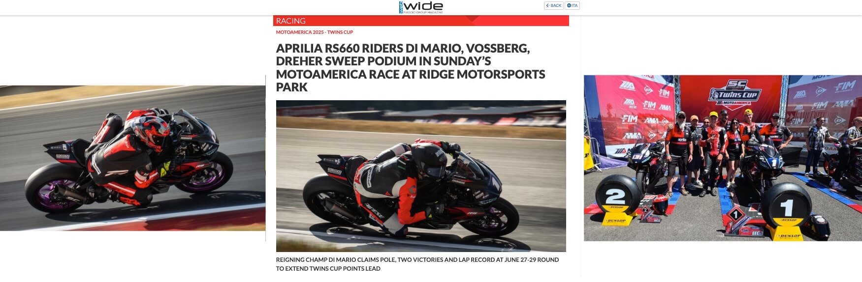 With his double victories, Di Mario extended his lead in the MotoAmerica Twins Cup standings to 67 points with four rounds remaining. Aprilia riders also hold key positions in the championship: Dreher sits third, Vossberg fifth, Cunnison eighth, and Weyh tenth.