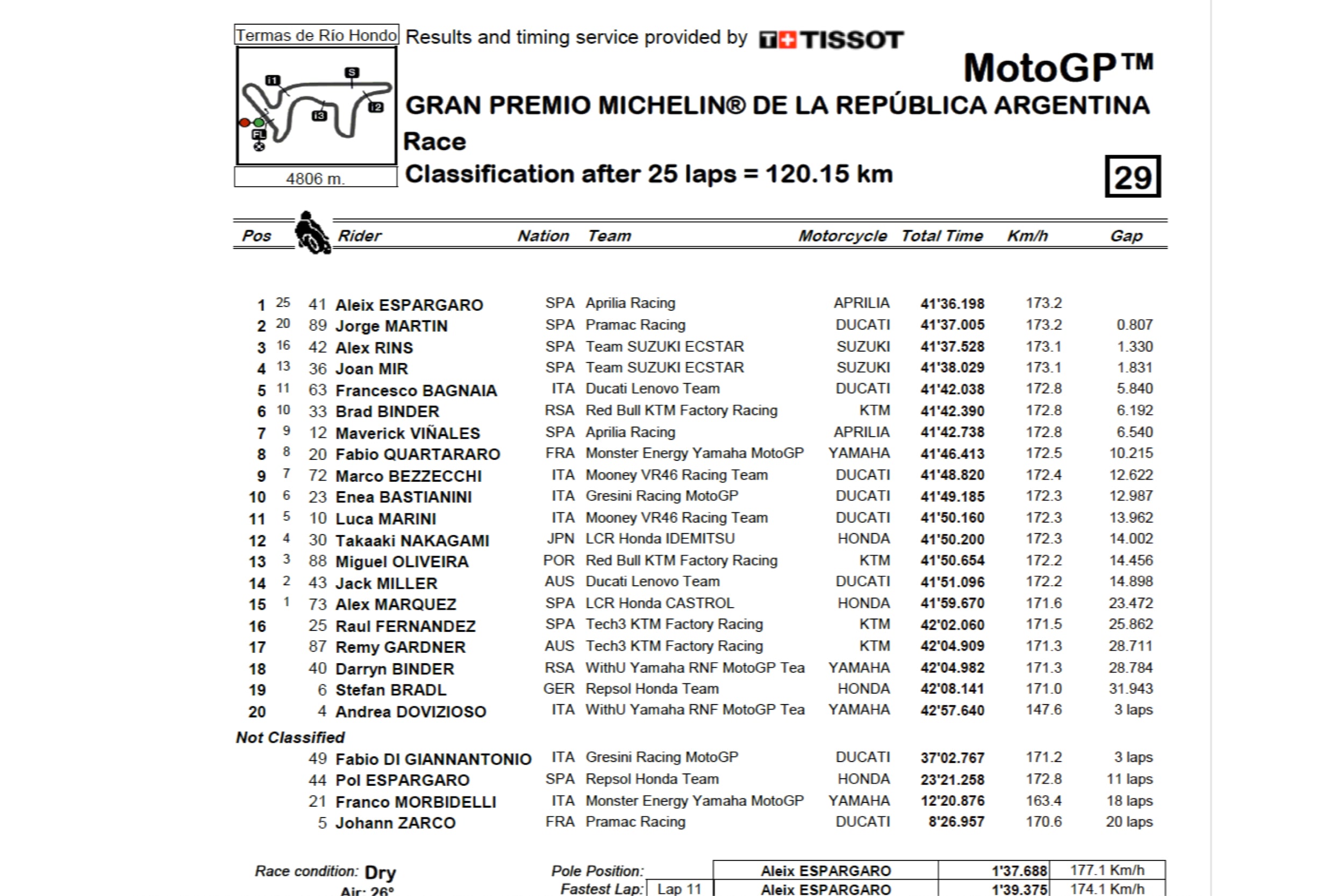 Thanks to this win, Espargaró is now leading in the overall rider standings with 45 points, further demonstration of a more than positive season start for the entire Aprilia Racing team which, at Termas de Rio Hondo, also saw Maverick Viñales taking home his best performance of the season after staying in the top five for quite a few laps.