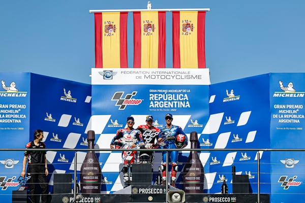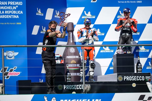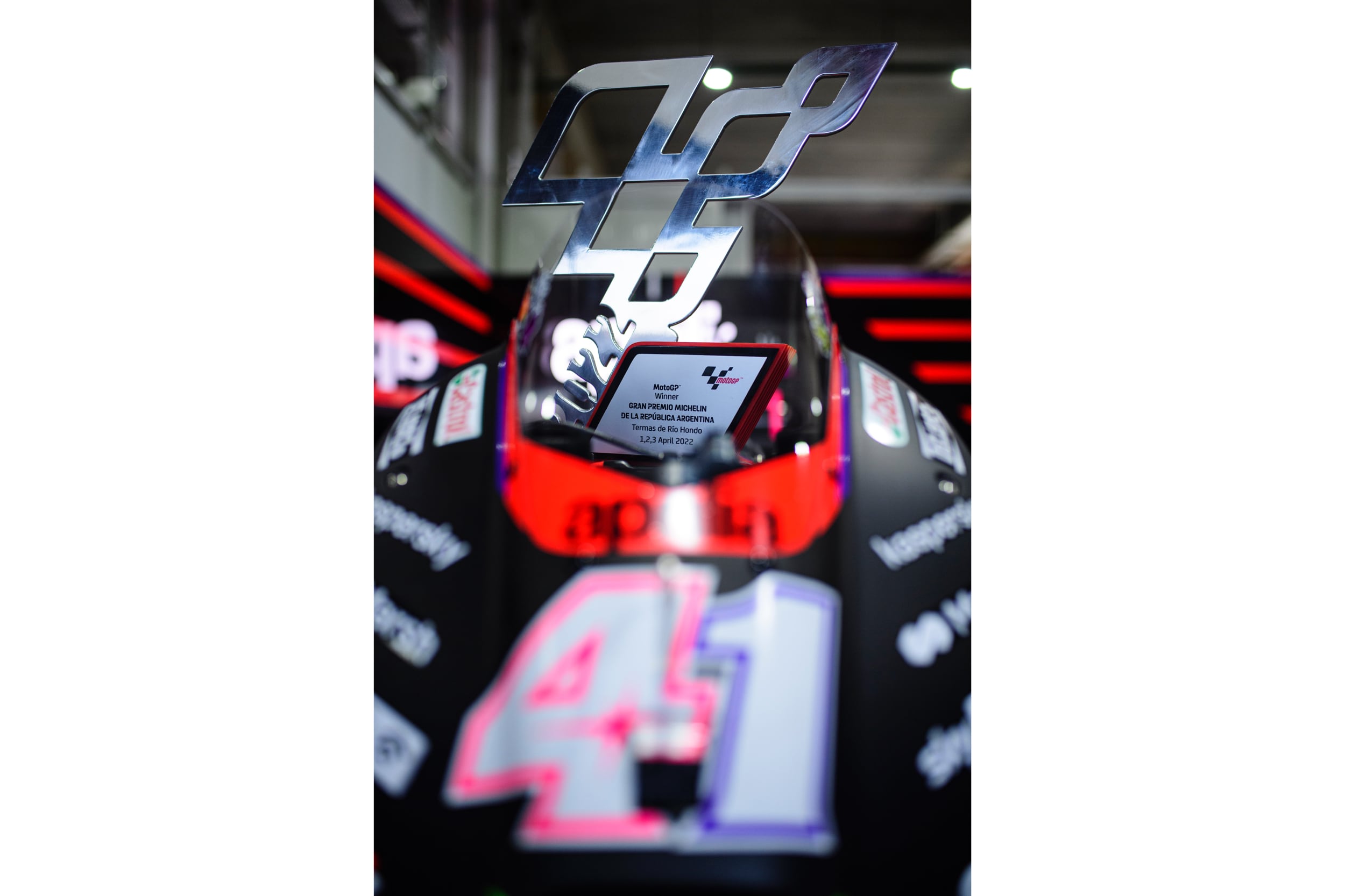 3 April 2022, Termas de Rio Hondo (Argentina) - Aprilia triumphs in the Grand Prix of Argentina, taking its first victory in the MotoGP class along with Aleix Espargaró. For the Noale-based manufacturer, one of the most victorious brands in the history of motorcycle racing, this is win number 295 in World Championship GP Motorcycle Racing, the first in the new four-stroke era of the premier two-wheeler class after countless wins in the 125 and 250 cc categories.
