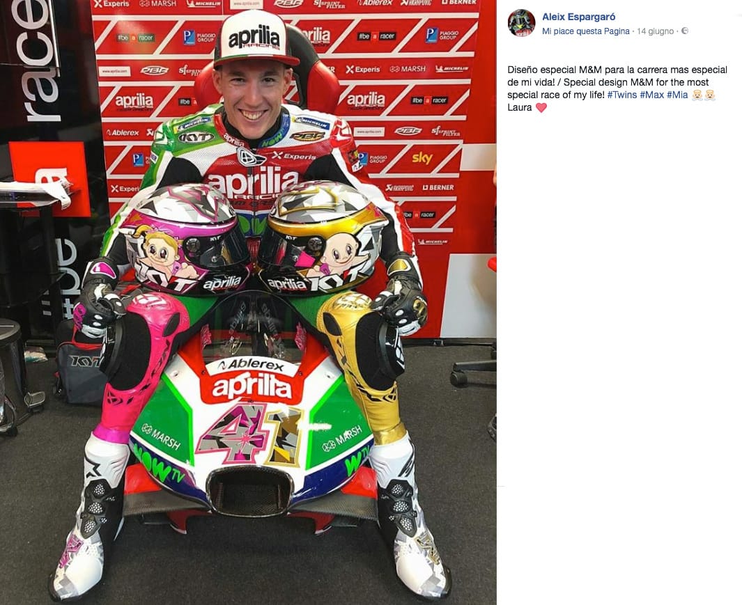Barcelona, 14 June 2018: Grand Prix eve with a smile for the “new” dad Aleix, posing with the helmets dedicated to M & M, Max and Mia, his twins.