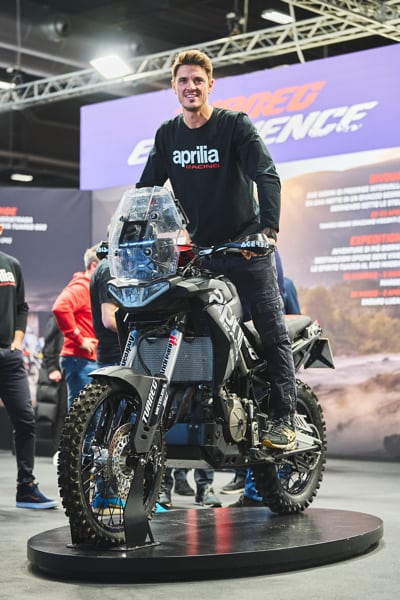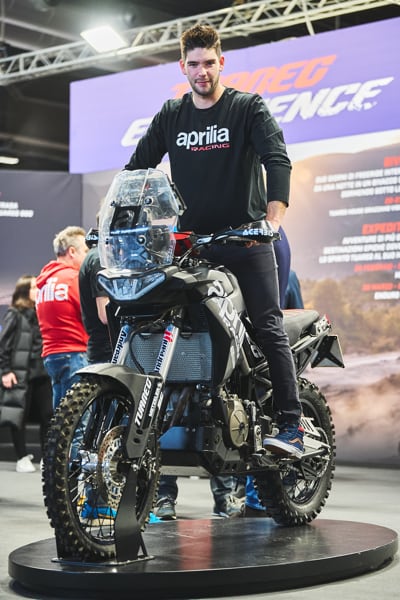 The rider Jacopo Cerutti, Italian Motorally Champion 2022 (and rich palmares) on Aprilia Tuareg 660 in front of the Aprilia Racing headquarters in Noale.