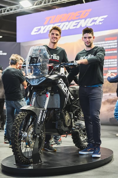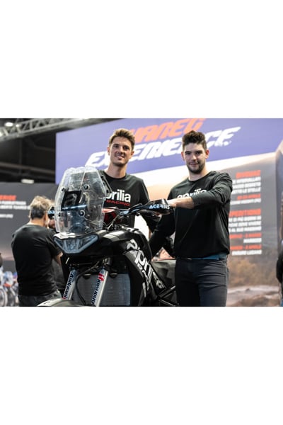The riders Jacopo Cerutti and Francesco Montanari in the Aprilia exhibition area at the MBE show in Verona.