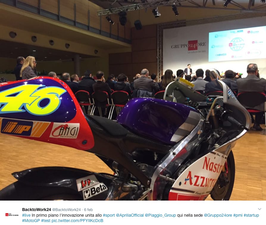 Milan, 30 January 2017 – BacktoWork24 – a subsidiary of Gruppo 24 Ore and leading player in the Italian market for investment in small and medium-sized enterprises and startups by private investors — and Aprilia Racing — the technological development platform of the Piaggio Group and Italian centre of excellence for innovation in the technical/motorcycle sector — have recently signed a partnership that then was presented at the Milan headquarters of the Gruppo 24 Ore on February 6.
