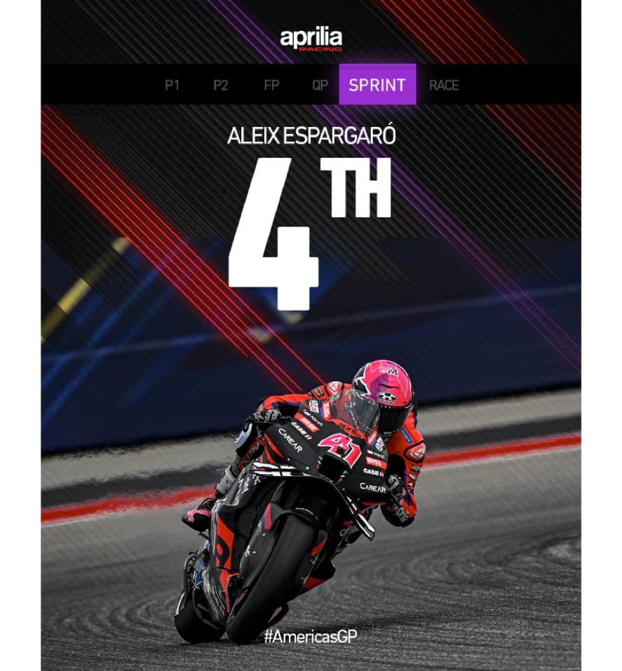 At the start of the 10-lap Sprint race, Aleix snatched third place straight away. In just a few laps he had improved even further, moving into second and staying there until the seventh lap. In the final battle for the third step of the podium, Aleix squeezed as much as possible from his RS-GP (second fastest race lap) and had his first medal of the season snatched from him by a hair. Great redemption on a “dark track” for him and for Aprilia.
