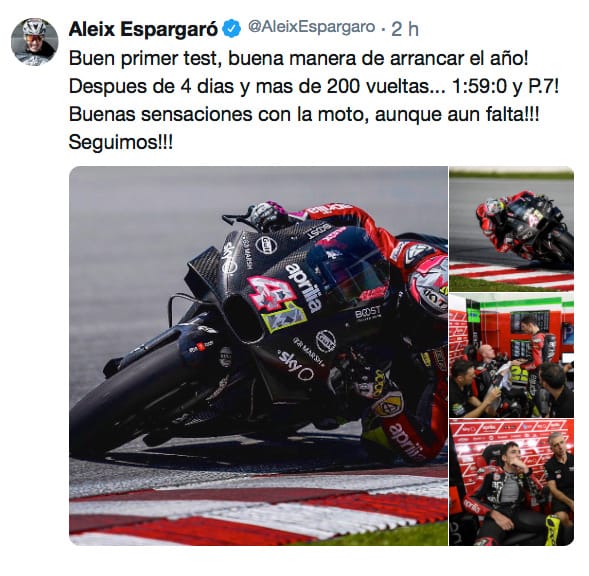 I'm pleased that what we did during the shakedown allowed Aleix to start from a good base. Seeing him lap at 1'59 brings great satisfaction for the entire team. I tried to give my best, conveying my sensations to the engineers, and I can’t wait to get back on the track in Qatar. First as a tester and then, on the race weekend, as a rider!"