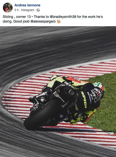 Andrea Iannone was able to count on a day of rest today, thanks to the contribution of test rider Bradley Smith, who put in an intense day of testing. The Italian rider, tired after a long antibiotic treatment and with the agreement of the team, chose not to take any risks after the good job done on the first two days, so he will turn up to the next tests in Qatar highly motivated.
