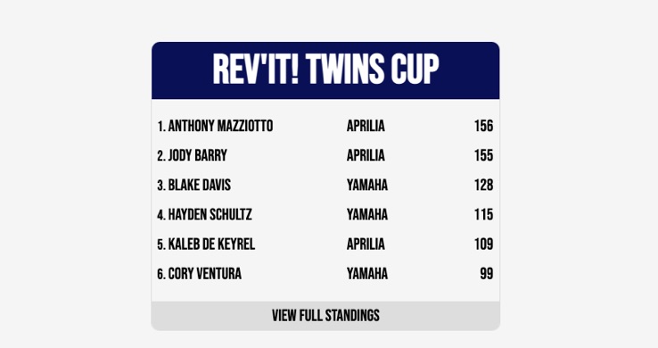 In the overall standings, with just three races left to go, there are now two Aprilia RS660 machines leading the Twins Cup championship with Anthony leading at 156 points, followed closely by Jody with 155 points.