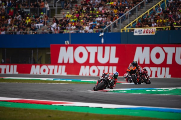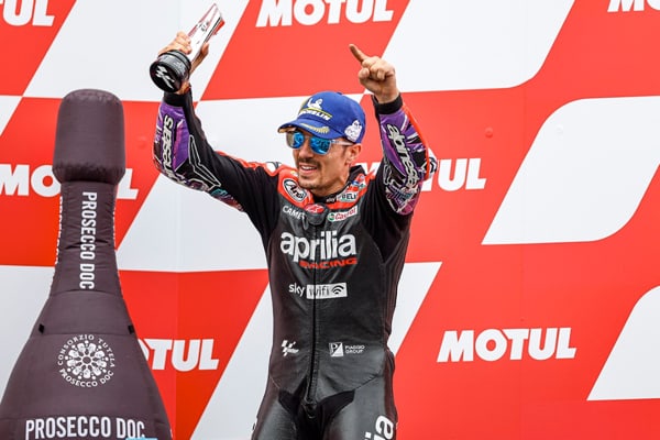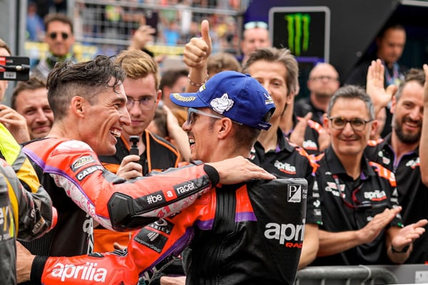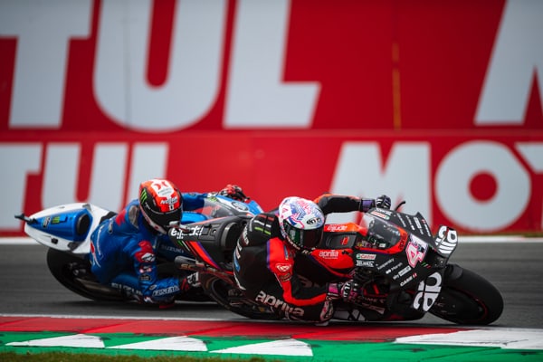 ALEIX, INVOLVED IN A CRASH BY QUARTARARO, PUTS IN AN EPIC PERFORMANCE ON THE TRACK, RIDING OUT OF THE GRAVEL, HE LAPS LIKE NO ONE ELSE ON THE TRACK AND COMES BACK FROM FIFTEENTH TO FOURTH PLACE. ALEIX IS NOW SECOND IN THE OVERALL STANDINGS, TWENTY-ONE POINTS BEHIND THE CHAMPIONSHIP LEADER. APRILIA RACING TAKES BACK THE TEAMS CHAMPIONSHIP LEADERSHIP.
