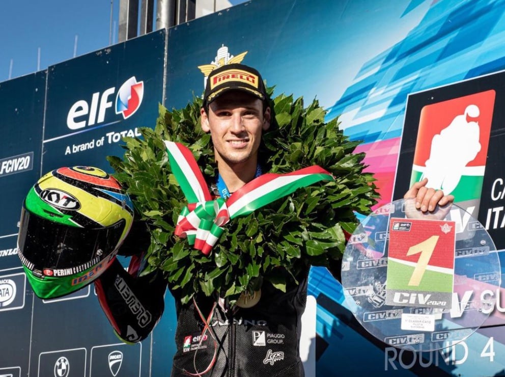 In 2020 he became an Aprilia test rider and dominated the CIV Superbike season with six wins out of eight races, earning the Italian Championship title astride the new Aprilia RSV4 Factory.