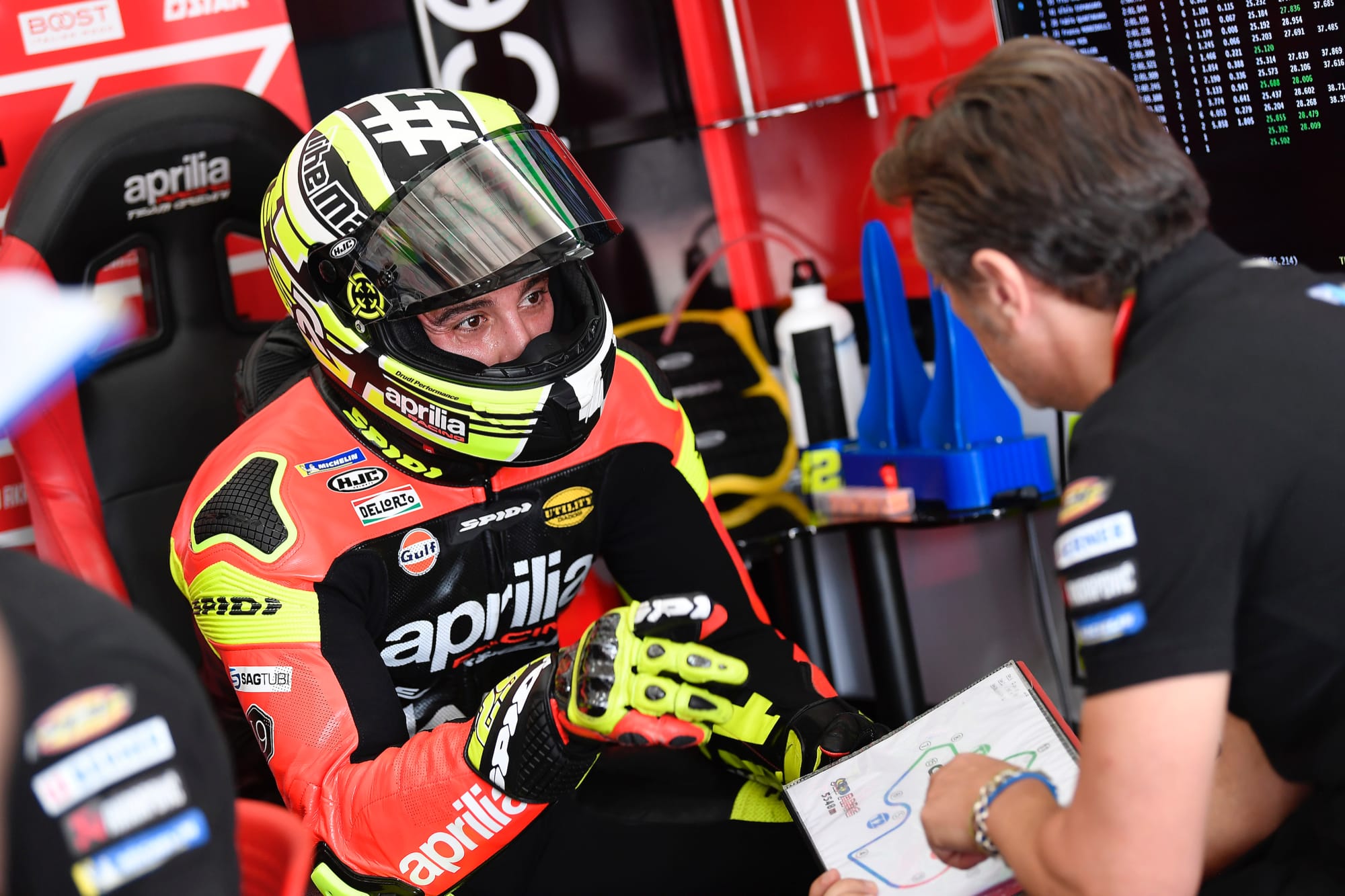 Andrea and his team, after their very first contact yesterday when the Italian rider threw a leg over the 2019 RS-GP for the first time, began to make some changes to the bike.