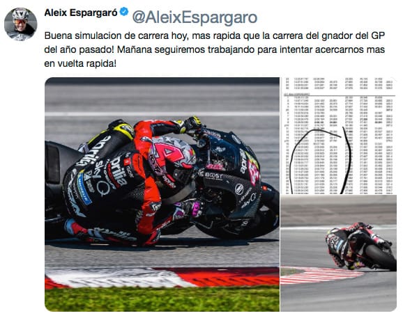 ALEIX ESPARGARO' (bike no. 41): "Today I did a 20-lap race simulation and I am very satisfied, both with how I held up physically and with the performance of the RS-GP. I managed to lap in the first half of the long run at 2'00 and in the low 2'01s for the second half - a good pace that confirms our competitiveness with used tyres.