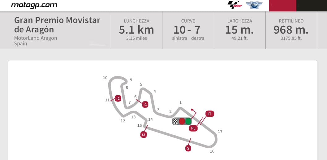 It is a complex circuit, characterized by both a long straight that lasts almost a kilometer and demanding direction and slope changes. The weather is often marked by rather high temperatures, which force riders and teams to carefully analyze tyre wear in order to maintain the best possible pace for all 23 laps in the race on Sunday.