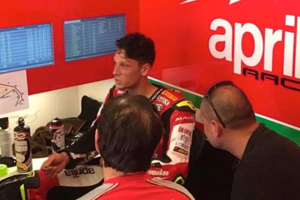 At the Race 1 start Eugene made a quick getaway. He held off a challenge from Davies into turn 3, holding third and chasing down Rea and Sykes ahead. Lapping on the leaders' pace, Eugene passed Sykes for second when the latter's pace dropped off. Eugene struggled with an issue on his bike's rear potentiometer late in the race, and went wide at the final corner to open the door for Davies to pass. Despite his set back he closed Davies down to reduce the gap from 1.7 to finish just 0.9 at the finish, and brought his Aprilia home a strong P3 and securing the team's first back-to-back podium run in WorldSBK. Lorenzo had a more difficult race, losing ground at the start. His pace initially looked strong before his rear tyre began to degrade, forcing him to dig deep to continue his momentum. At the middle distance he and other riders struggled with rising track and tyre temperatures, and he eventually came home P8.