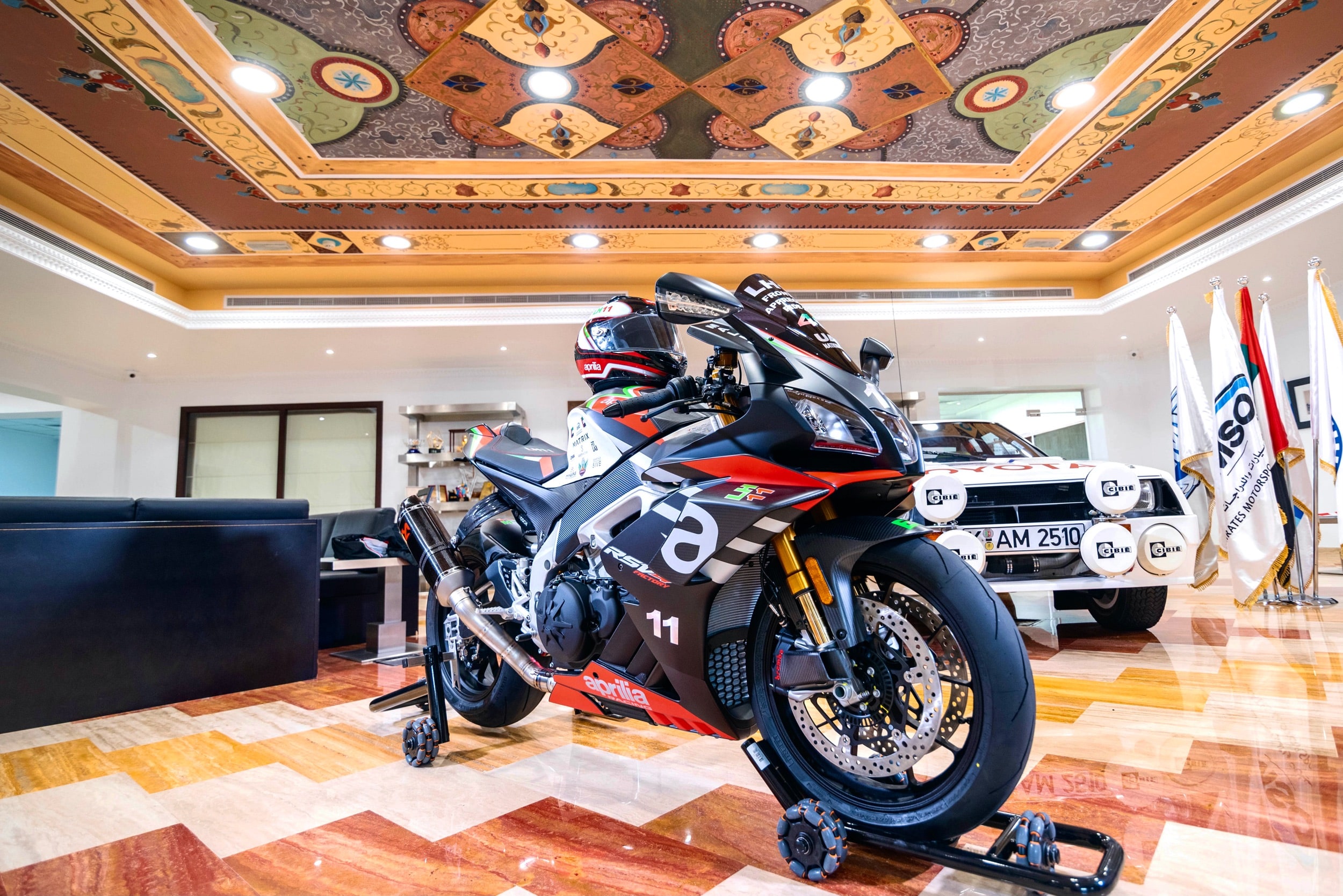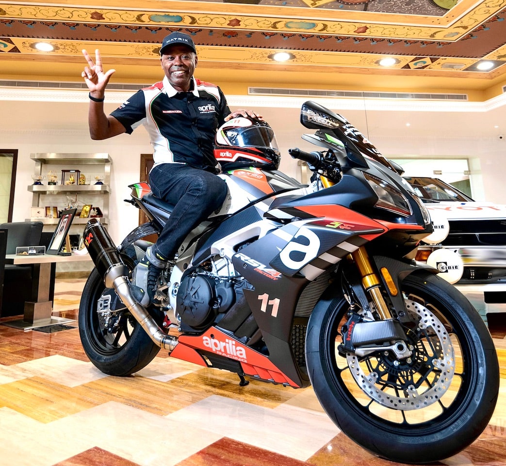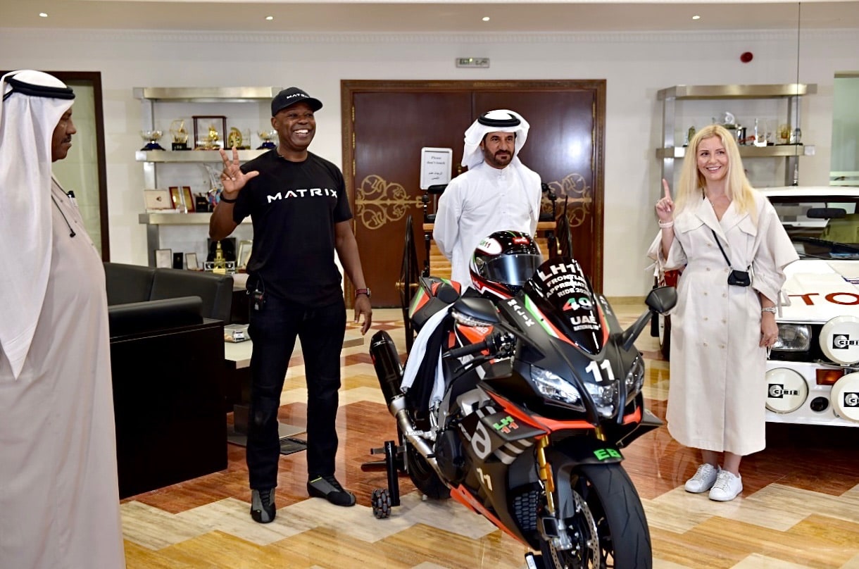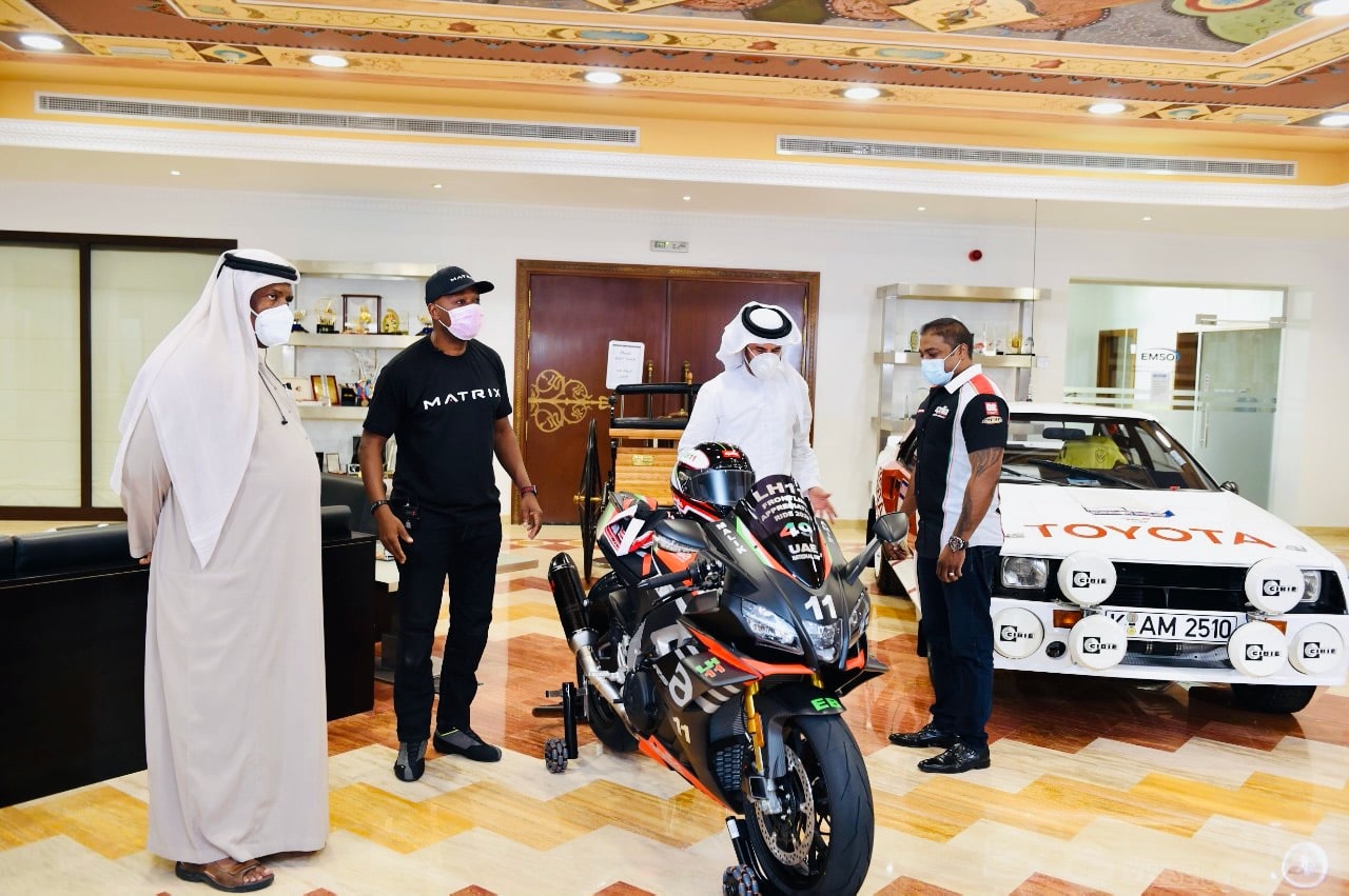 Mr. Vincent Bosco writes: “Society Motors UAE is delighted to announce that Lotfi Hamrouni, the Endurance Motorcycle World Record Holder known as LH11 has become the proud owner of the 2021 APRILIA RSV4 1100 Factory on 11.11. 2020 at 11.11am, at a special motorcycle revealing ceremony hosted by Emirates Motorsports Organization in Dubai with a special honorary guest the UAE Rally Champion and legend driver Dr. Mohammed Ben Sulayem.
