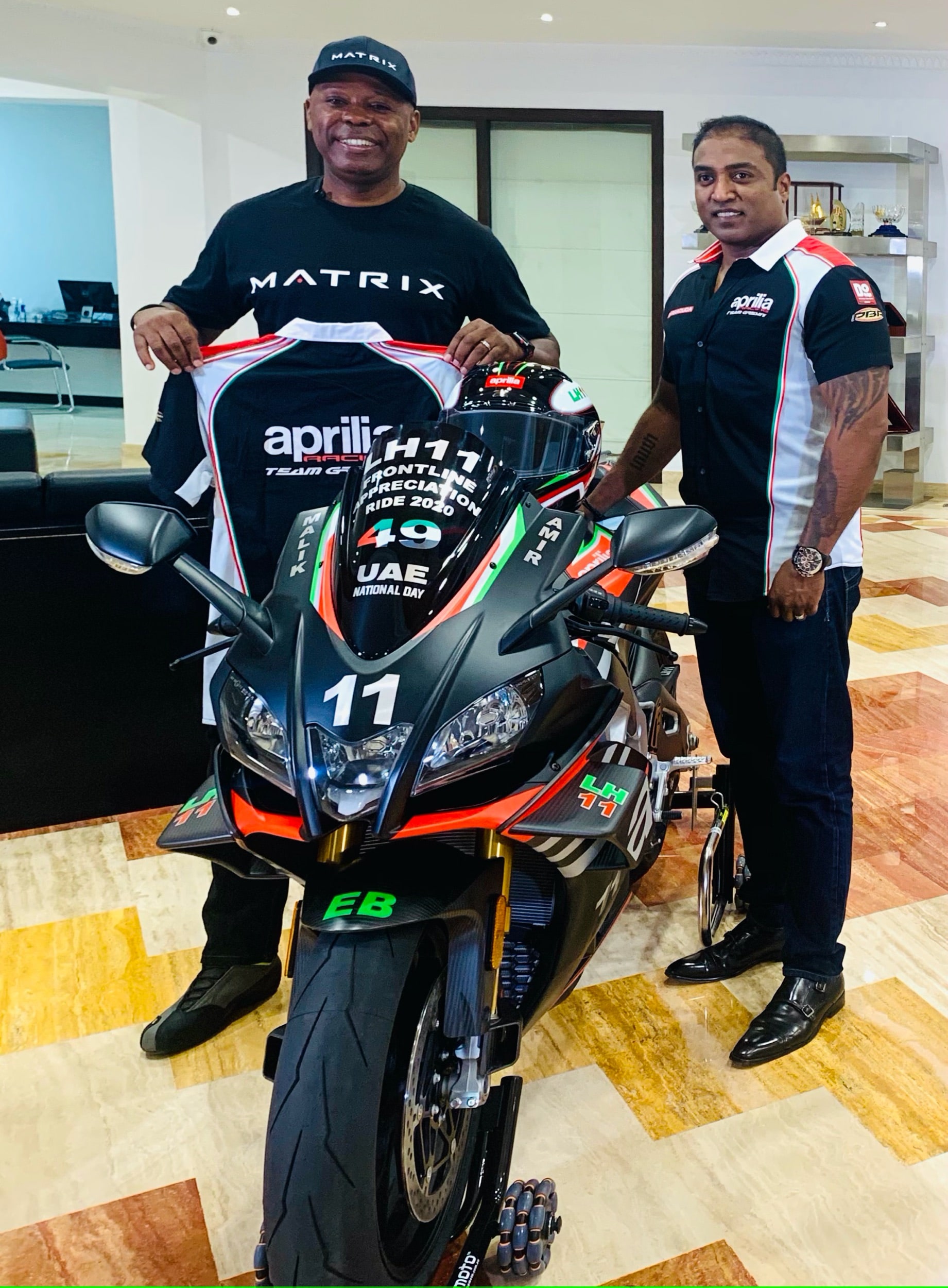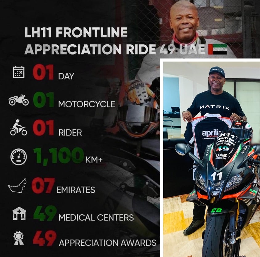 Mr. Vincent continues: “In honor of the United Arab Emirates’ 49th National Day on December 2nd, Lotfi will be riding his APRILIA RSV4 1100 Factory for one full day above 1,100 km, visiting 49 Hospitals across the 7 Emirates. It’s LH11’s way of saying THANK YOU to all the Frontline Heroes in UAE who tirelessly served and kept us safe and healthy and continue to do so. LH 11 will be riding his Aprilia RSV4 Factory to give Appreciation Certificates to Hospitals and Medical Centers signed by the UAE Ministry of Health & Prevention, Emirates Motorsports Organization, UAE National Olympic Games Committee and LH11.