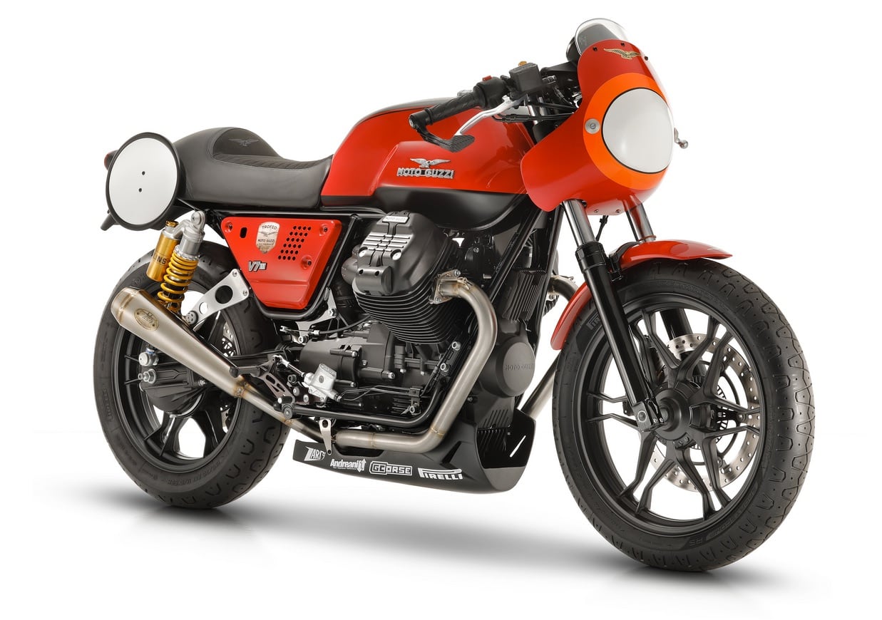 Further improved Racing Kit developed by the Guareschi brothers. The Moto Guzzi V7 III, a bike that has garnered favour from a truly diversified public thanks to its agility and easy ride, will once again be the protagonist of the Trophy, representing the perfect starting point to create an easy and fun bike that can be used on the track even by those of us who do not have any racing experience. Outfitted with the GCorse Racing Kit developed by the Guareschi brothers, highly popular Moto Guzzi tuners even in the sports environment, la “seven-fifty” from Mandello proved to be astonishingly fast and extremely reliable on all the circuits where races were held in 2019. In addition to safety devices, including, for example, undersump and front brake lever protection, the Kit - compulsory and obviously the same for everyone - includes a package of functional and aesthetic mods. These include the top fairing, semi-handlebars, complete exhaust system, raised footpegs, side panels, single-seat saddle and rear mudguard, racing number plates, front suspension cartridges kit and rear shock absorbers. Completing the equipment package are specific ECU engine mapping and dedicated front brake pads.