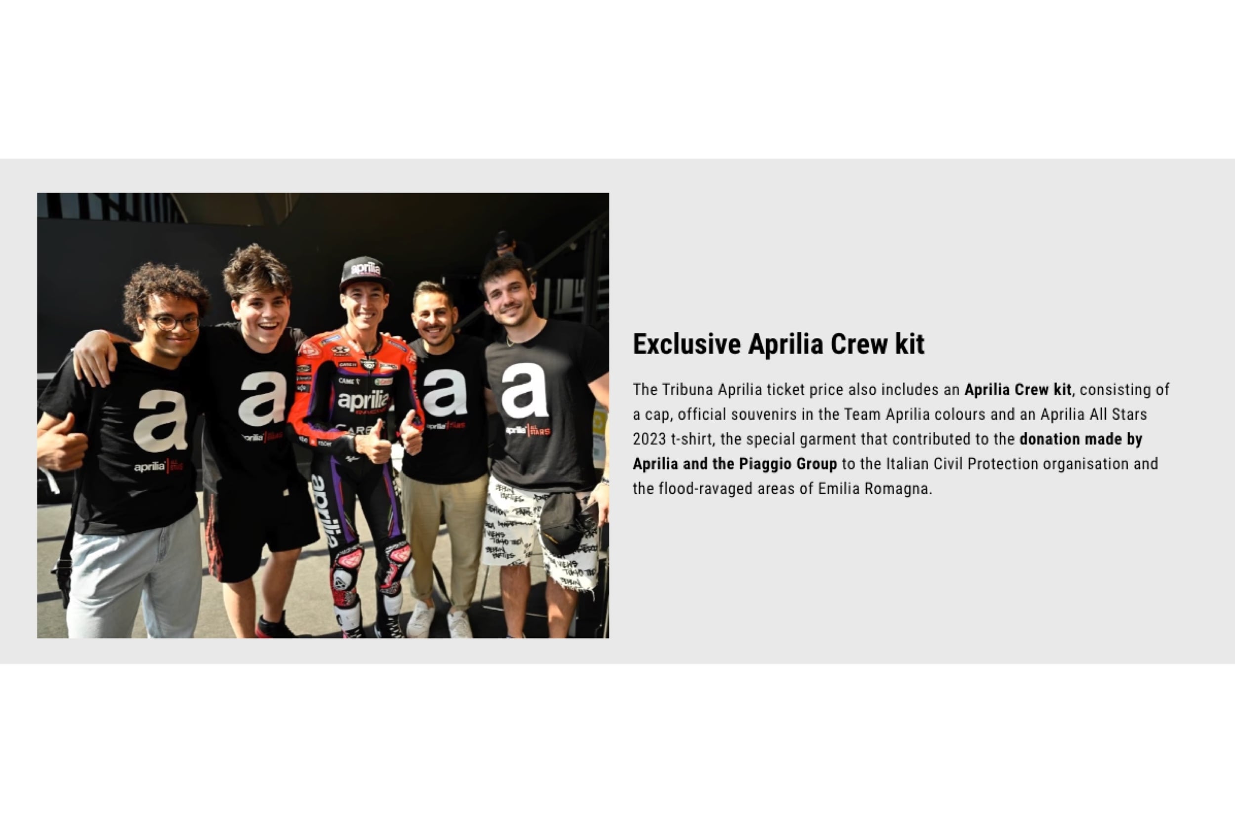 All the fans in the grandstand will receive that Aprilia Racing kit which also includes the special T-shirt made to support residents of Emilia-Romagna, recently struck by flooding. The GP of San Marino will also be a chance to contribute to the fund-raising efforts in support of the Emilia Romagna Civil Protection, a time to stand by and provide concrete help to a region which every motorsport enthusiast holds dear to their hearts.