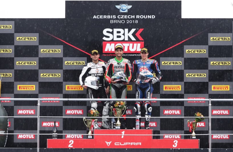 Brno (Czech Republic), 10 June 2018 – Sunday at Brno had proved dry, with temperatures in the region of 30°C, up until a few minutes before the start of the Superstock 1000 race, when the wind unexpectedly brought in rain clouds, soaking the Automotodrom Brno. Previously established settings for the RSV4 FW-STK were therefore changed on the grid in light of the wet conditions. Right off the line, Maximilian Scheib got the better of the poleman, passing him to take an early lead and building a two-second advantage over his closest rival in the first lap alone. In the space of two laps, the Chilean rider had extended his lead to three seconds, allowing him to manage his race and retain his position without pushing too hard. Maximilian Scheib thus crossed the line first, to win his first Superstock 1000 race on board the Aprilia RSV4 FW-STK with a clear margin.