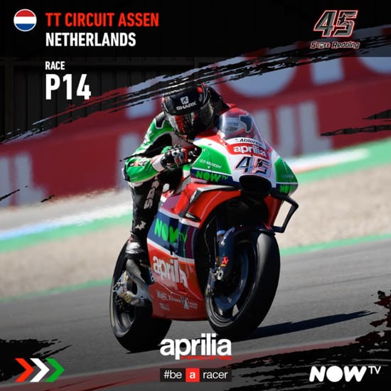 Scott rode his best race yet astride the RS-GP on the historic Dutch track. Starting from the sixth row, Scott was seventeenth at the end of the first lap. Finding a good pace, he moved up through the pack until catching up, and on one occasion overtaking, his teammate. The fourteenth place finish, 16 seconds behind the winner, is a good result that shows the progress the English rider has made in the last two races.