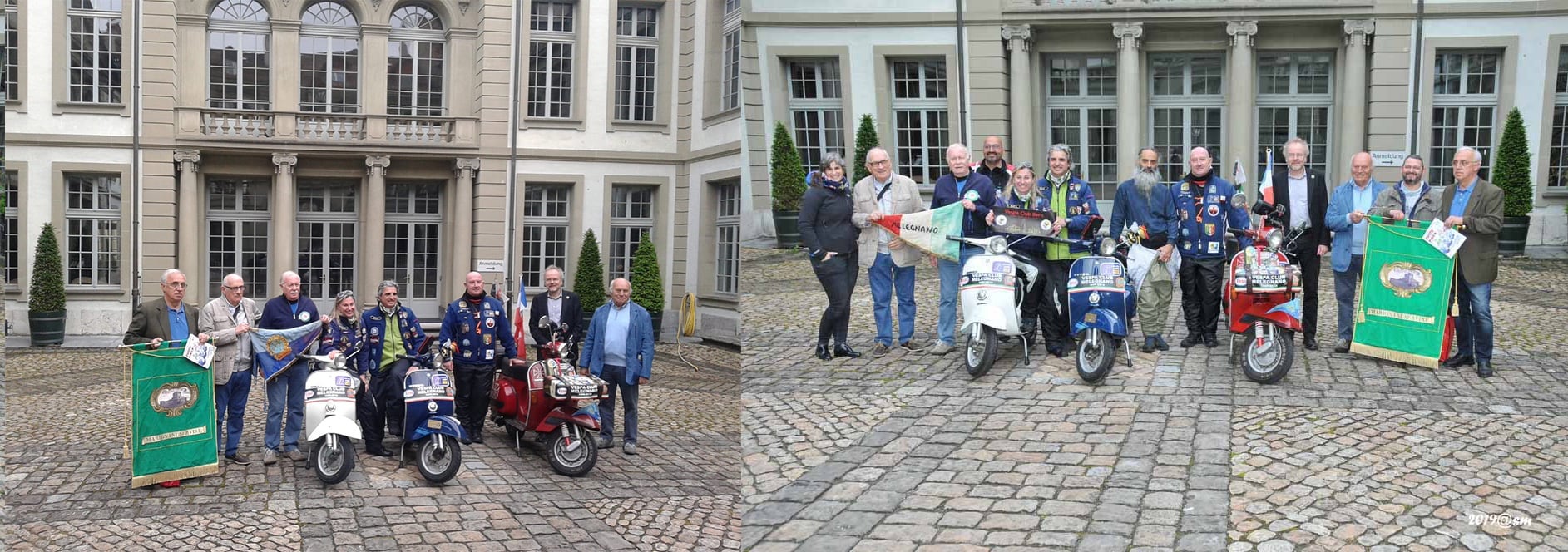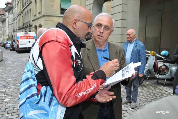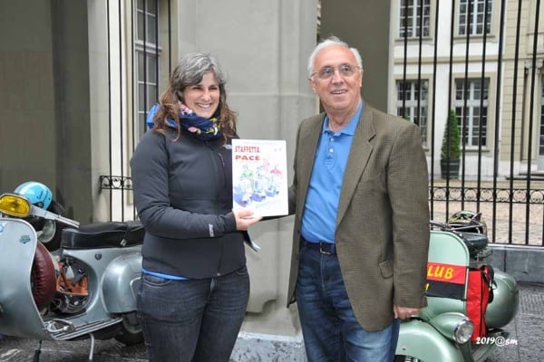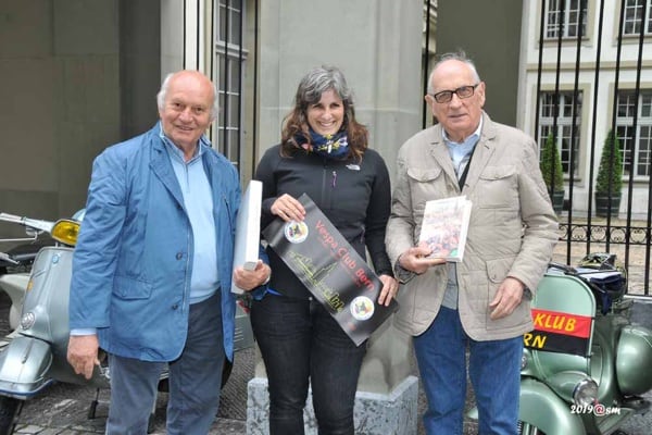 Cold cuts and mountain pasture cheeses consolidate the friendship and ensure we don’t regret the time spent at a laden table. The Berne Vespa Club is waiting for us at the city gates: a welcome, photos and finally a chance to meet face to face after months of phone calls and emails to organise the event. The busy city traffic is no problem for people accustomed to riding in the Milan area, and we soon reach the city centre, where we are greeted by an official from Berne city hall, Jurg Wichtermann, and taken inside, with our Vespa scooters making a triumphal entrance into the main courtyard, for photos and exchanges of gifts, terminating in a convivial meal in a local restaurant.