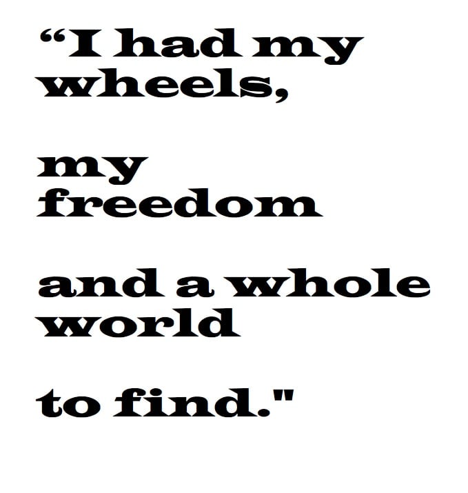 I started at the front of the convoy, but soon they were driving at 70 mph, which was too fast on my wobbly wheels, and the cars began passing me. Before long, I was at the back and the last tail gunner pulled alongside, the driver gesturing me to hurry.