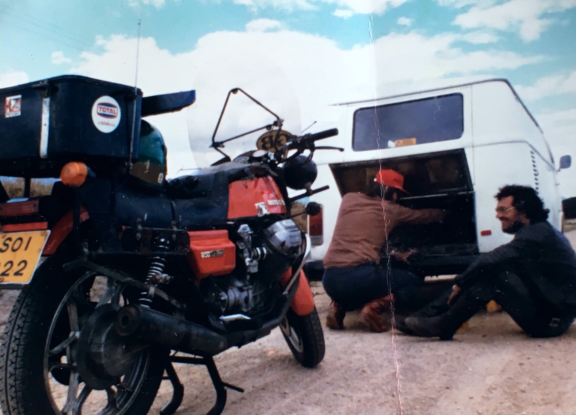 The Land Rover was desert-equipped, but two VW Campervans, a Moto Guzzi Le Mans, and the 1200cc Datsun Cherry were completely out of place!