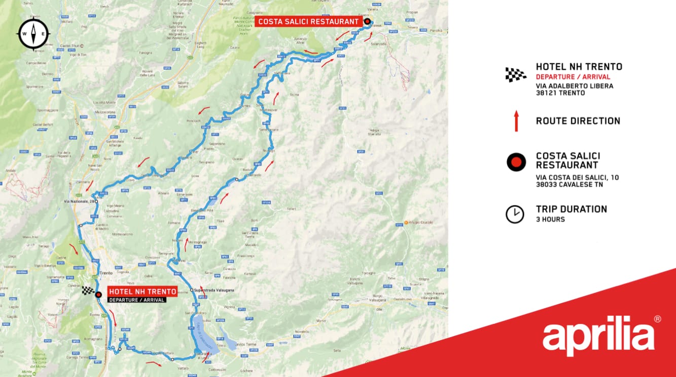 A SPECIAL ITINERARY FOR A MOTORBIKE TRIP, FOLLOWING THE ROAD MAP USED FOR THE PRESS LAUNCH OF THE NEW APRILIA TUONO V4 1100: FROM TRENTO TO CAVALESE AND BACK. THREE HOURS OF PURE RIDING PLEASURE, IN ENCHANTING SCENERY. THE REGION IS A BIKER FAVOURITE, WITH ITS SPLENDID PANORAMIC ROADS – LIKE THE “GROSSE DOLOMITENSTRASSE” – MAKING FOR A MEMORABLE EXPERIENCE. AND WHY NOT DISCOVER THE AREA’S OTHER BEAUTY SPOTS, FROM LAKE GARDA TO THE DOLOMITES.