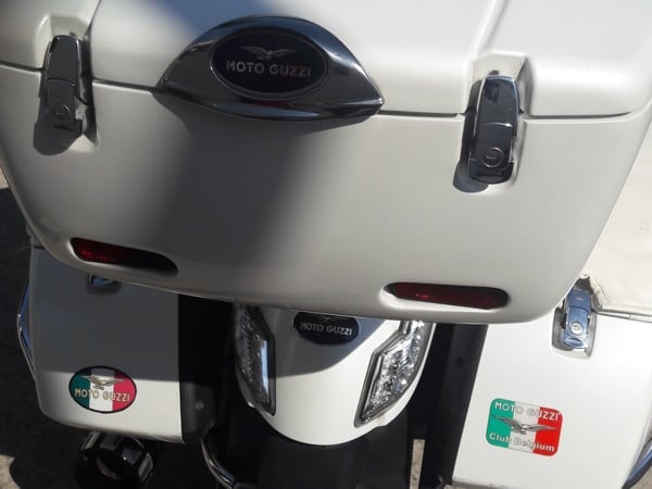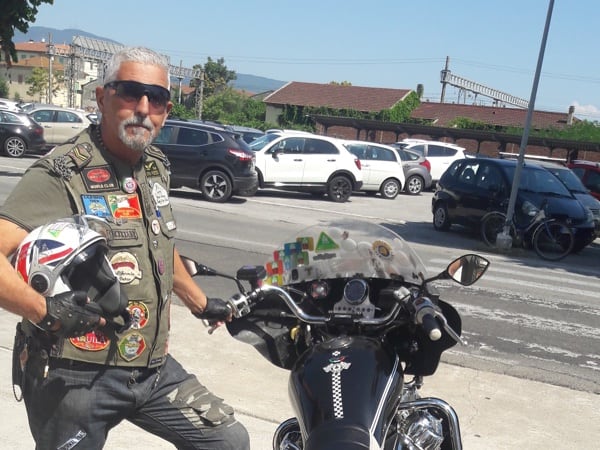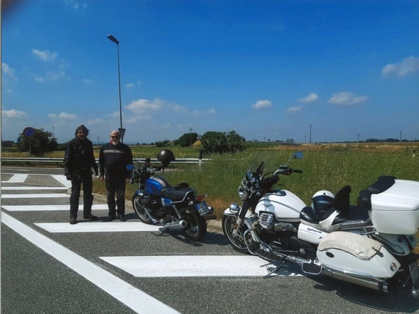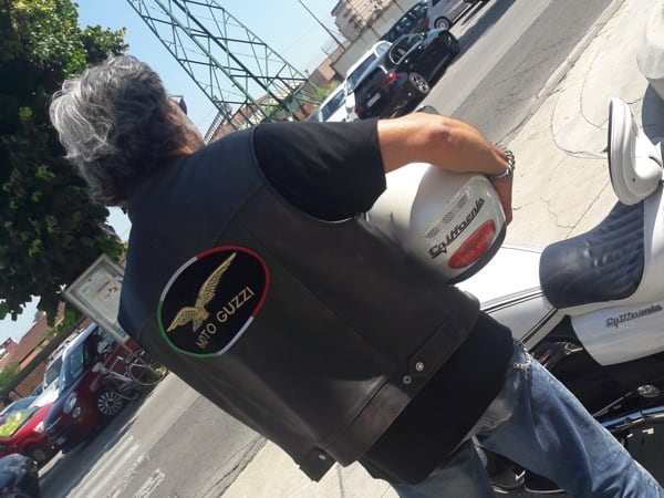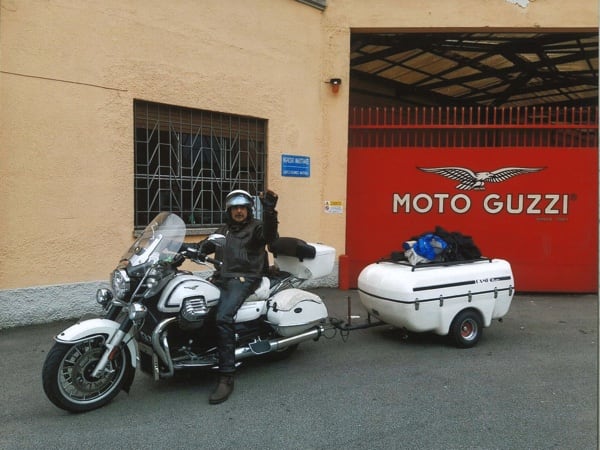 Manuele concludes (in the photos above he is with his friend Pandy in front of the Piaggio Group headquarters in Pontedera, Tuscany): “We Guzzisti (Guzzi lovers) are anxiously awaiting – for the upcoming first Moto Guzzi centennial, 1921-2021 – a new California, maybe a limited edition, with a ‘100’ on the tank and livery. Some other wishes that I would convey to the Eagle manufacturer designers and engineers: engine capacity increased to 1800 (the ideal would be 1921 cc as a tribute to the centennial), obviously air-cooled; mudguards always in metal (no plastic). And, lastly, an applause for the success of the V85 TT (I came across one during my trip!): so we are expecting other stock models, like an evolution of the Norge and maybe a Stelvio in racing style. Keep up the good work, and long live Moto Guzzi!”