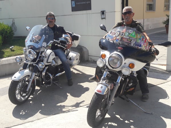 On the left, Guzzisti Manuel and Pandy on their fantastic MG California in front of the Piaggio Group headquarters, Pontedera (Pisa).