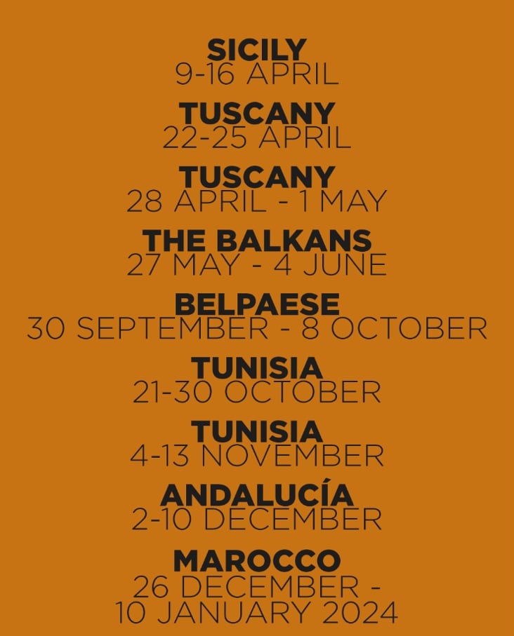 The Touring programmes anticipate 9 trips. They kick off in April (9-16) with the tour in Sicily astride the new Moto Guzzi V100 Mandello, exploring the ‘Trinacria’, through Palermo, Agrigento, Syracuse and the hinterlands. There are two available dates for the rides over the white roads of Tuscany (22-25 April; 28 April-1 May) with the Moto Guzzi V85 TT, through Chianti, Crete Senesi, and Val d’Orcia. One week in the Balkans (27 May-4 June) with the Moto Guzzi V100 Mandello tourer, 2,000 km long, from the coast of Dalmatia to the fjords of the Bay of Kotor, all the way to the heart of the Balkans, entering the Park of Durmitor, and returning through Trieste.