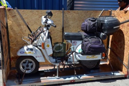 Sending the Vespa ahead turned out to be more difficult than expected. We had it serviced, then packed it into a special steel and OSB crate we made ourselves that complied with all the current legislation. Sandra looked after the shipping to San Antonio, a port about 100 km from Santiago.