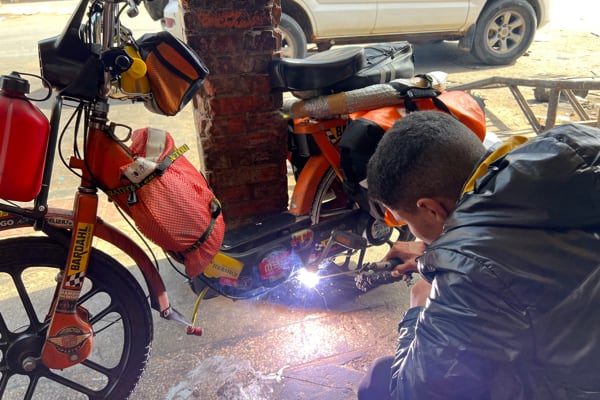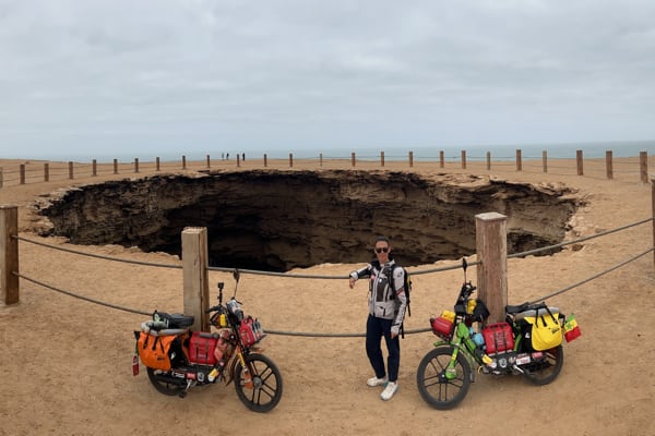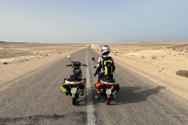 Having Dakar hero, Franco Picco, as a neighbour. The encounter with Dakar legend (2015 FIM Cross-Country Rally Legend) and neighbour Franco Picco (editor’s note: famous motorcycle racer specialising in rally raids: 29 participations in the Dakar Rally, two wins in the Pharaohs Rally, including the first on Gilera in 1992), and his stories about his African adventures led to the decision Mirco and Alice took in January 2022: they decided to ride the route from Paris to Dakar, in summer, on two mopeds! The trip started on July 31st in 2022 under the Eiffel Tower in Paris; on the first part of the journey they managed to cover about 200 km a day on the French country roads to the port in Sète, where they crossed the Mediterranean. On the sixth day they set foot on Moroccan soil in Tangier and headed south along the Atlantic coast. On the bumpy back roads, the CIAOs without rear suspension soon took their toll: bolts came loose due to the vibrations and flat tires repeatedly forced repairs at the side of the road. Via Essauira and Agadir, they reached Tantan on the eleventh day, where the sandy winds were a particular problem, forcing Mirco to set up the tent on the side of the road every time he needed to clean the carburettors.
